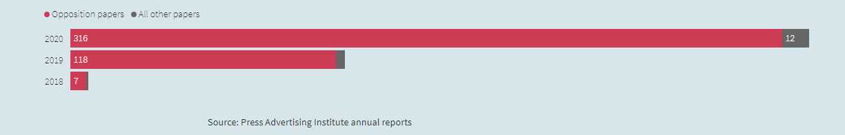 Οι αναστολές διαφημίσεων που σχετίζονται με την ηθική που επιβλήθηκαν στις μεγαλύτερες εθνικές εφημερίδες, με έδρα την Κωνσταντινούπολη, υπερδιπλασιάστηκαν το 2020 σε 328 ημέρες σε σχέση με το προηγούμενο έτος. Σχεδόν όλες οι αναστολές επιβλήθηκαν στις πέντε πιο επιφανείς ανεξάρτητες εφημερίδες που αποκλείστηκαν από κοινού από περίπου 4 εκατομμύρια λίρες σε κρατικές διαφημιστικές πληρωμές το 2020. Μια έκθεση του επαγγελματικού φορέα της Ένωσης Τούρκων Δημοσιογράφων (TGC) ανέφερε ότι οι αναστολές το 2021 συνέχισαν να επικεντρώνονται σε ανεξάρτητες εφημερίδες.