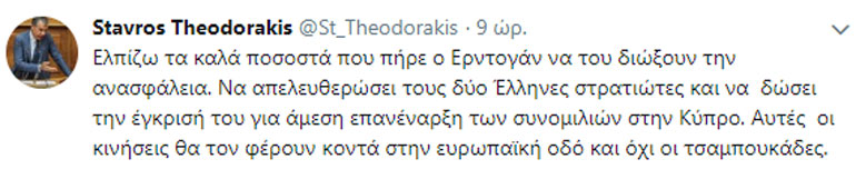 «Ελπίζω τα καλά ποσοστά που πήρε ο Ερντογάν να του διώξουν την ανασφάλεια. Να απελευθερώσει τους δύο Έλληνες στρατιώτες και να δώσει την έγκρισή του για άμεση επανέναρξη των συνομιλιών στην Κύπρο. Αυτές οι κινήσεις θα τον φέρουν κοντά στην ευρωπαϊκή οδό και όχι οι τσαμπουκάδες» έγραψε στην ανάρτησή του ο επικεφαλής του Ποταμιού.