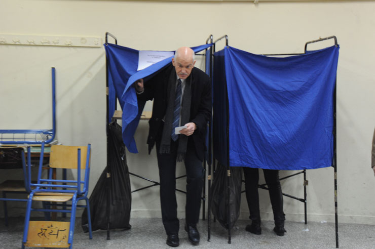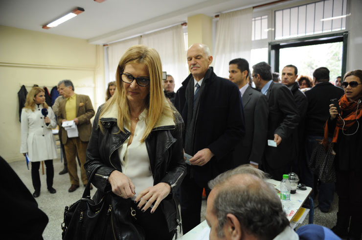 Με υπομονή περίμενε τη σειρά του ο Γιώργος Παπανδρέου για να ψηφίσει μαζί με τη σύζυγό του στο εκλογικό του κέντρο στη Νέα Ερυθραία.