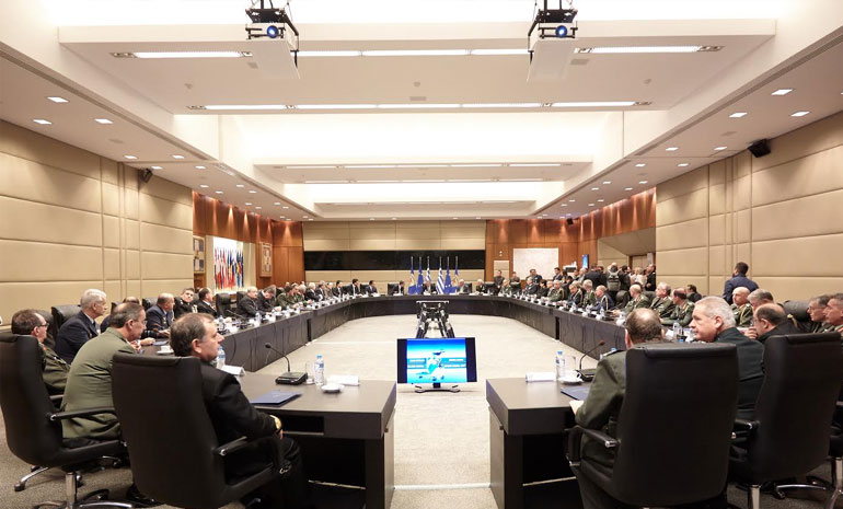 Στην αίθουσα συσκέψεων τον υποδέχτηκαν επίσης ο αναπληρωτής υπουργός Δημήτρης Βίτσας και οι αρχηγοί των Κλάδων.