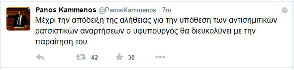 Σημειώνεται ότι από την ώρα που έγινε γνωστή η υπουργοποίηση του Δημήτρη Καμμένου, ξέσπασε θύελλα αντιδράσεων, καθώς, κατά το παρελθόν είχε βρεθεί υπόλογος με αφορμή ρατσιστικές αναρτήσεις σε ιστοσελίδες κοινωνικής δικτύωσης.