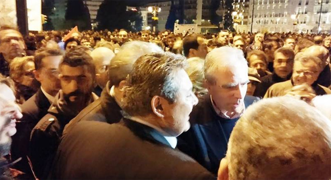 Ο πρόεδρος των Ανεξάρτητων Ελλήνων, Πάνος Καμμένος, μαζί με την Κοινοβουλευτική Ομάδα, βγήκαν από τη Βουλή και κατέβηκαν στη συγκέντρωση διαμαρτυρίας για το πολυνομοσχέδιο στην πλατεία Συντάγματος.