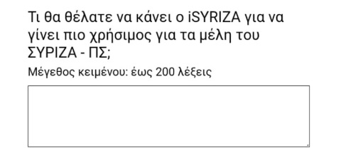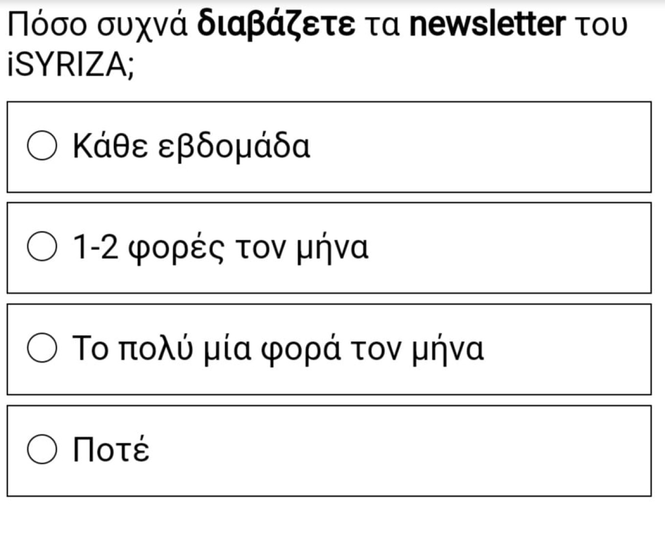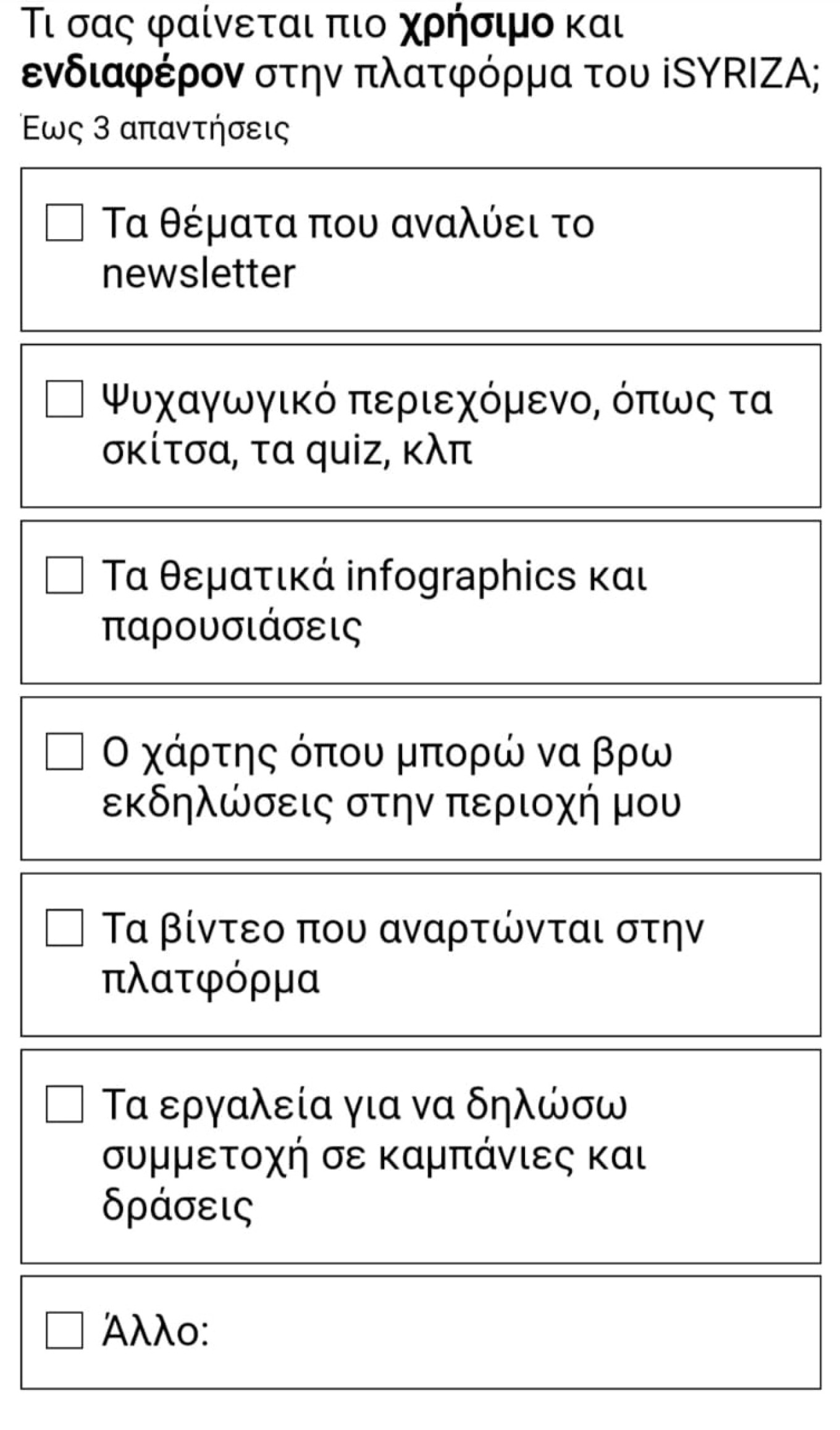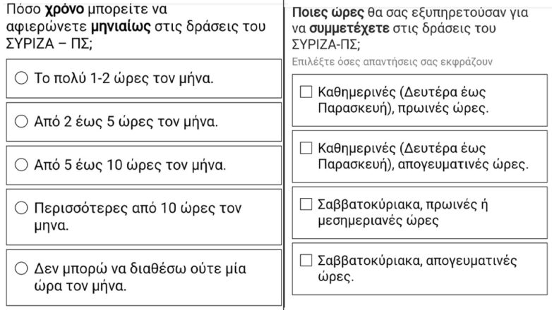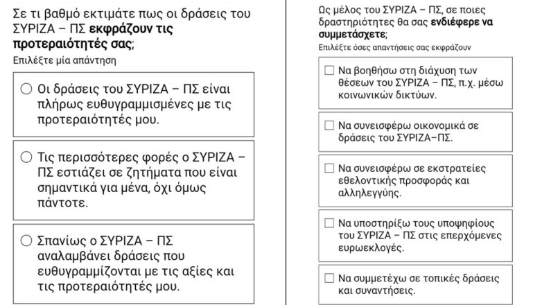 Πρόκειται για ερωτηματολόγιο εννέα βημάτων (με δυνατότητα πολλαπλών απαντήσεων), μεταξύ άλλων αναφορικά με τα ζητήματα που απασχολούν περισσότερο την καθημερινότητα των μελών, τις δράσεις και τις προτεραιότητες του κόμματος, καθώς και τους τρόπους και τον βαθμό συμμετοχής τους στις δράσεις του.