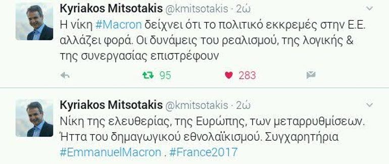 Τα συγχαρητήριά του στον νικητή των γαλλικών προεδρικών εκλογών Εμανουέλ Μακρόν έστειλε ο Κυριάκος Μητσοτάκης με ένα tweet...