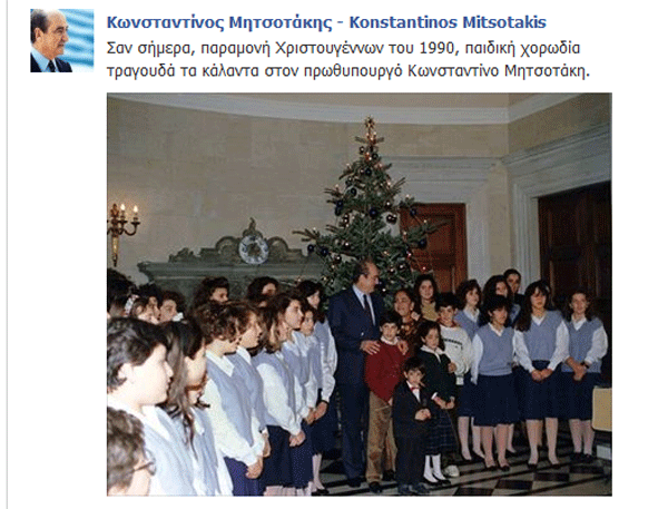 Τη φωτογραφία συνόδευσε με τη λεζάντα: «Σαν σήμερα, παραμονή Χριστουγέννων του 1990, παιδική χορωδία τραγουδά τα κάλαντα στον πρωθυπουργό Κωνσταντίνο Μητσοτάκη».