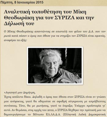 Mία επιστολή-βόμβα του Μίκη Θεοδωράκη κατά του ΣΥΡΙΖΑ, αναρτήθηκε στο blog http://theodorakism.blogspot.gr. Ο μεγάλος μουσικοσυνθέτης με το κείμενό αποκαλύπτει το παρασκήνιο της «στήριξής» του στον ΣΥΡΙΖΑ και απαντά στον φίλο του Δ.Α. που τον ρωτά κατά πόσον ο όρος που έθεσε για να στηρίξει το κόμμα της αξιωματικής αντιπολίτευσης είναι εφικτός.