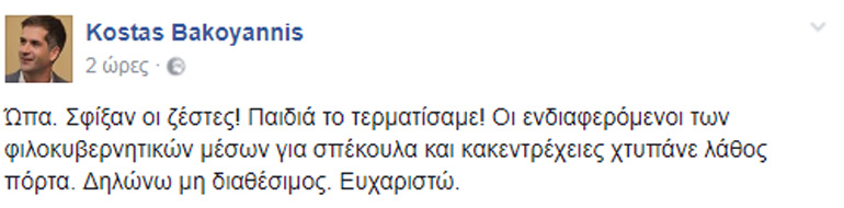 «Ώπα. Σφίξαν οι ζέστες! Παιδιά το τερματίσαμε! Οι ενδιαφερόμενοι των φιλοκυβερνητικών μέσων για σπέκουλα και κακεντρέχειες χτυπάνε λάθος πόρτα. Δηλώνω μη διαθέσιμος. Ευχαριστώ», έγραψε ο κ. Μπακογιάννης.