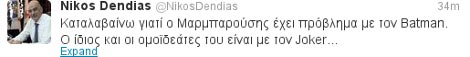 Μπάτμαν αποκάλεσε τον Νίκο Δένδια ο βουλευτής της Χρυσής Αυγής Κωνσταντίνος Μπαρμπαρούσης.