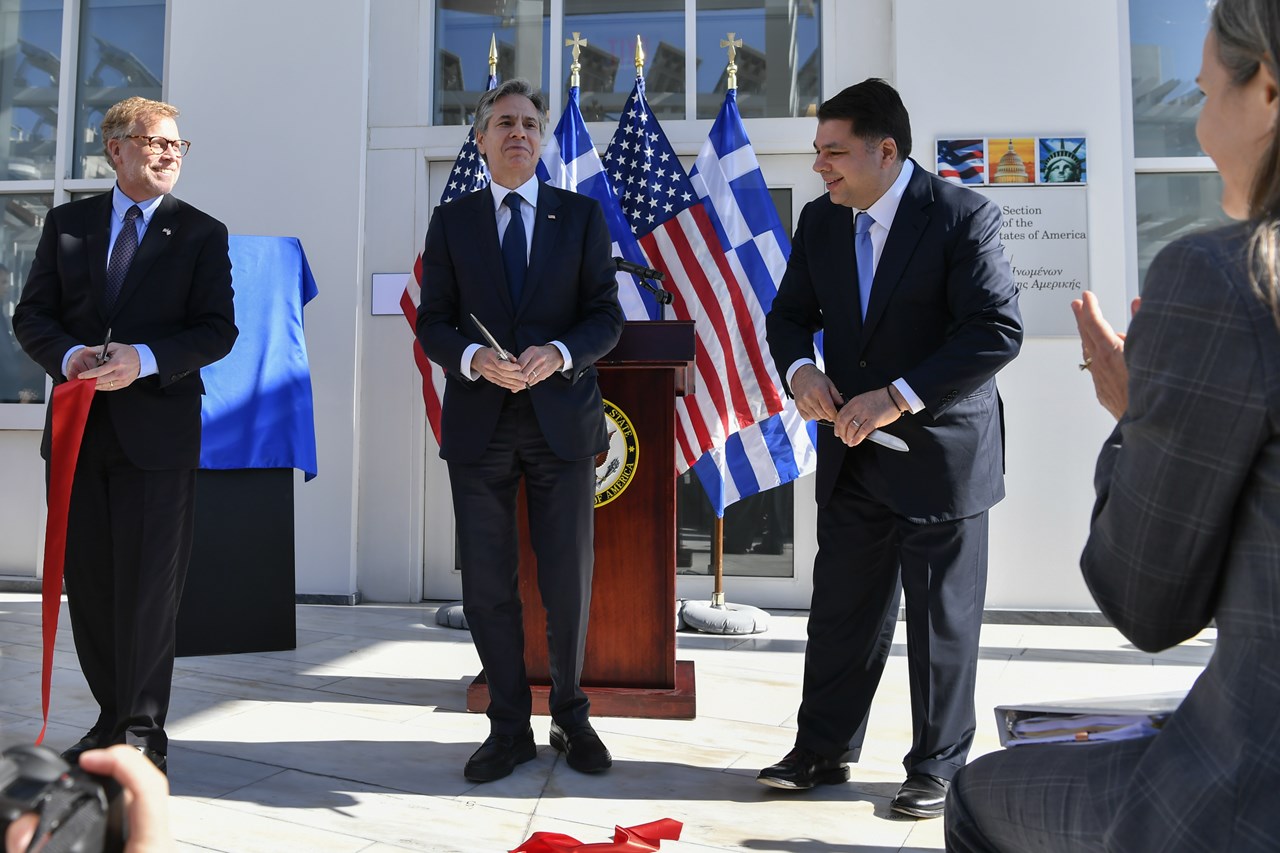 Τα εγκαίνια της επέκτασης του κτιρίου της αμερικανικής πρεσβείας στην Αθήνα, τη βόρεια πτέρυγα πλέον, εγκαινίασε ο υπουργός Εξωτερικών των ΗΠΑ Άντονι Μπλίνκεν. Κόβοντας την κορδέλα των εγκαινίων στην είσοδο της νέας πτέρυγας της πρεσβείας, μαζί με τον πρεσβευτή των ΗΠΑ στην Ελλάδα Τζορτζ Τσούνη, παρουσία του Αρχιεπισκόπου Ιερώνυμου, του περιφερειάρχη Αττικής Γιώργου Πατούλη και του δημάρχου Αθηναίων Κώστα Μπακογιάννη, ο Άντονι Μπλίνκεν είπε πως είναι μια συμβολική και μια πρακτική στιγμή για την αμερικανική διπλωματική αποστολή στην Αθήνα. Ευχαρίστησε την ελληνική κυβέρνηση και τον φίλο του και αξιόλογο πρέσβη, όπως τον αποκάλεσε, Τζορτζ Τσούνη. «Δεν θα μπορούσαμε να έχουμε καλύτερο εκπρόσωπο των ΗΠΑ στην Ελλάδα» συμπλήρωσε ο επικεφαλής του Στέιτ Ντιπάρτμεντ.