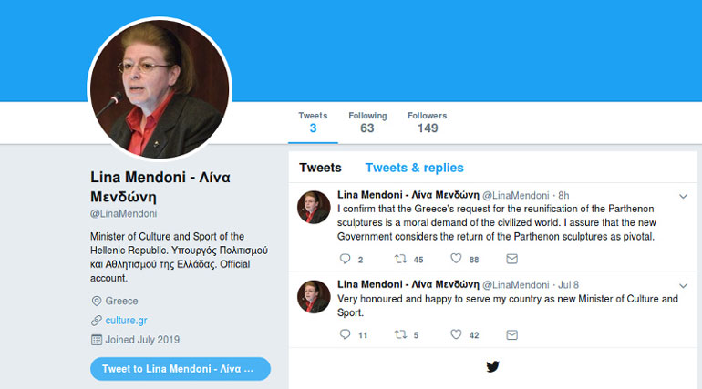 Αργά το απόγευμα της Τετάρτης κυκλοφόρησε στα social media μία δήλωση της νέας υπουργού Πολιτισμού Λίνας Μενδώνη για την επιστροφή των Μαρμάρων του Παρθενώνα. Με όνομα χρήστη @LinaMendoni και με το όνομά της στα αγγλικά και στα ελληνικά δημοσιεύτηκαν δύο tweets.