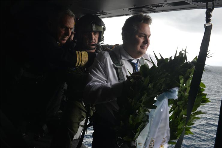 Ο κ. Καμμένος, μετέβη με ελικόπτερο της Αεροπορίας Στρατού ΝΗ-90 στην περιοχή των Ιμίων, προκειμένου να ρίξει στεφάνι στον υγρό τάφο των τριών ηρώων.