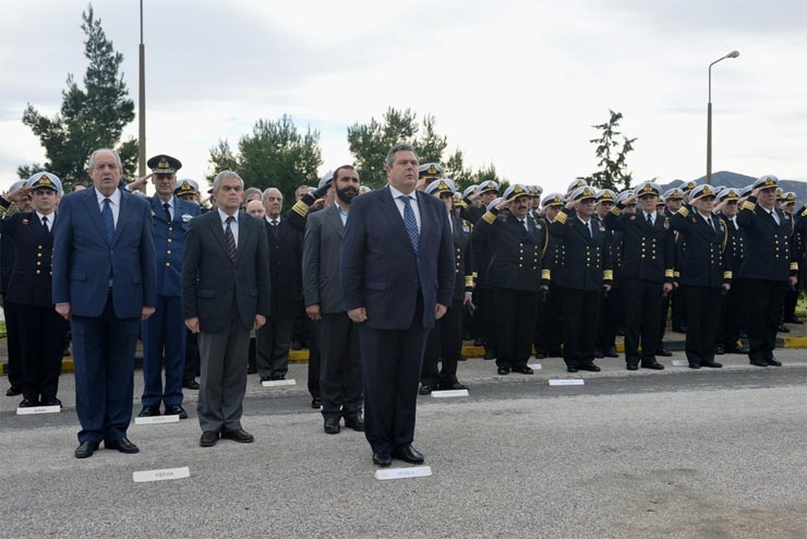 Τον υπουργό Εθνικής Άμυνας συνοδεύουν ο αρχηγός ΓΕΝ, αντιναύαρχος Ευάγγελος Αποστολάκης και οι παριστάμενοι στην εκδήλωση, αρχηγός ΓΕΑ, αντιπτέραρχος Ευάγγελος Τουρνάς και ο βουλευτής Ηρακλείου των Ανεξαρτήτων Ελλήνων Κώστας Δαμαβολίτης.