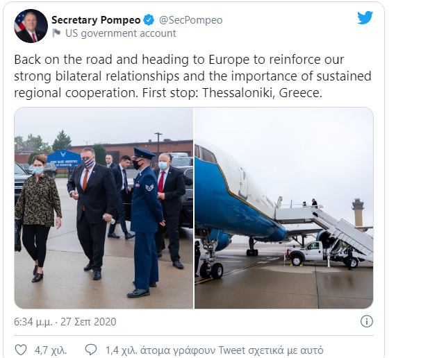 Ενώ βρισκόταν εν για την Ελλάδα ο Πομπέο έστειλε ένα μήνυμα μέσω Twitter.