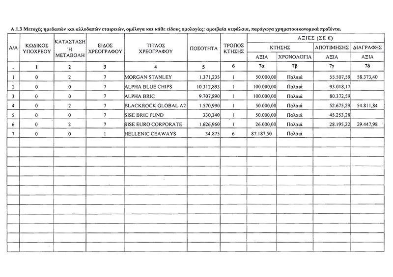 Συγκεκριμένα, εμφανίζεται να έχει πουλήσει αμοιβαία κεφάλαια της BLACKROCK GLOBAL με τίμημα 54.811,84 ευρώ, μερίδια αμοιβαίων κεφαλαίων της SISE EURO CORPORATE εισπράττοντας 29.447,98 ευρώ, καθώς και μερίδια αμοιβαίων κεφαλαίων της MORGAN STANLEY εισπράττοντας 58.373, 4 ευρώ.