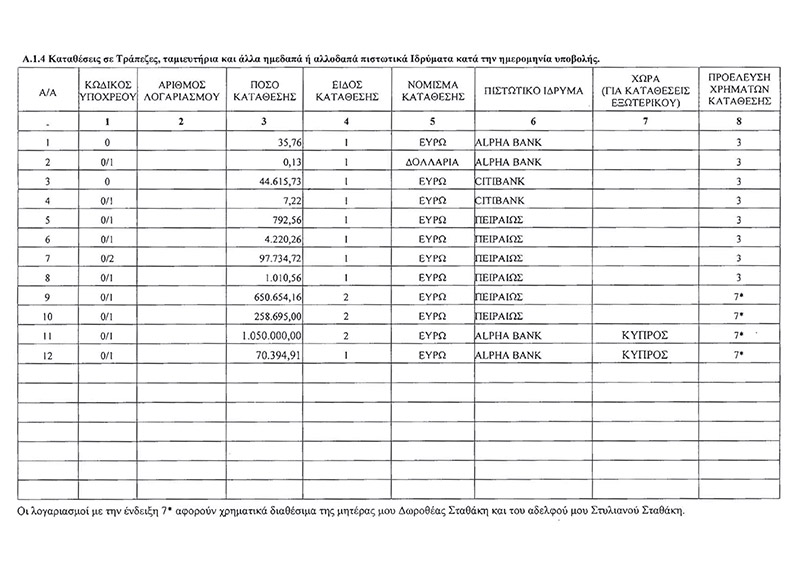 Καταθέσεις ύψους 2.178.161,01 ευρώ σε τράπεζες της Ελλάδος και της Κύπρου διαθέτει ο υπουργός Οικονομίας Γιώργος Σταθάκης.