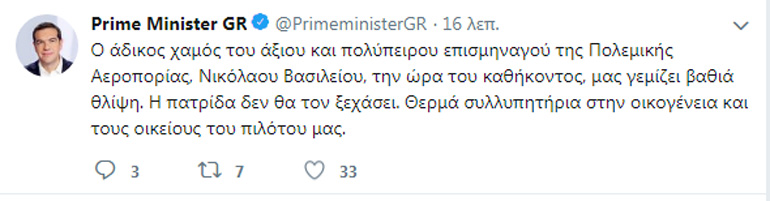«Ο άδικος χαμός του άξιου και πολύπειρου επισμηναγού της Πολεμικής Αεροπορίας, Νικόλαου Βασιλείου, την ώρα του καθήκοντος, μας γεμίζει βαθιά θλίψη. Η πατρίδα δεν θα τον ξεχάσει. Θερμά συλλυπητήρια στην οικογένεια και τους οικείους του πιλότου μας» έγραψε ο πρωθυπουργός, Αλέξης Τσίπρας, σε ανάρτηση του στο twitter για τον θάνατο του κυβερνήτη του στρατιωτικού αεροσκάφους.