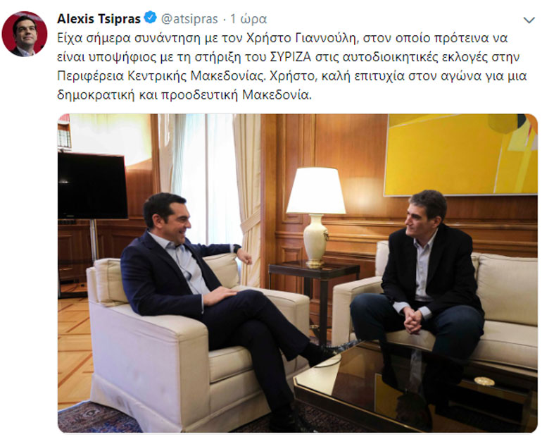 «Είχα σήμερα συνάντηση με τον Χρήστο Γιαννούλη, στον οποίο πρότεινα να είναι υποψήφιος με τη στήριξη του ΣΥ.ΡΙΖ.Α. στις αυτοδιοικητικές εκλογές στην Περιφέρεια Κεντρικής Μακεδονίας. Χρήστο, καλή επιτυχία στον αγώνα για μια δημοκρατική και προοδευτική Μακεδονία» έγραψε ο πρωθυπουργός στα κοινωνικά του δίκτυα.