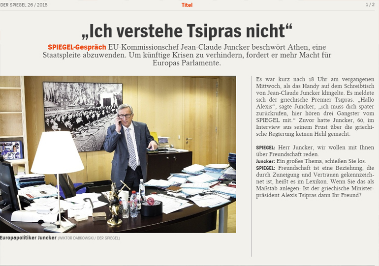 Την προσήλωσή του στην προσπάθεια αποτροπής της εξόδου της Ελλάδας από την ευρωζώνη εκφράζει ο πρόεδρος της Ευρωπαϊκής Επιτροπής Ζαν-Κλοντ Γιούνκερ σε συνέντευξή του η οποία δημοσιεύεται στο περιοδικό «Der Spiegel».