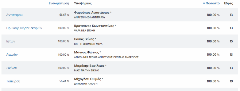 Απόλυτη υπήρξε η κυριαρχία τους για τους δημάρχους: Αντιπάρου, Αναστάσιο Φαρούτο, Ηρωικής Νήσου Ψαρών, Κωνσταντίνο Βρατσάνο, Ιητών, Γκίκα Γκίκα, Λειψών, Φώτη Μάγγο, Σικίνου, Βασίλειο Μαράκη και Τοπείρου, Θωμά Μίχογλου.