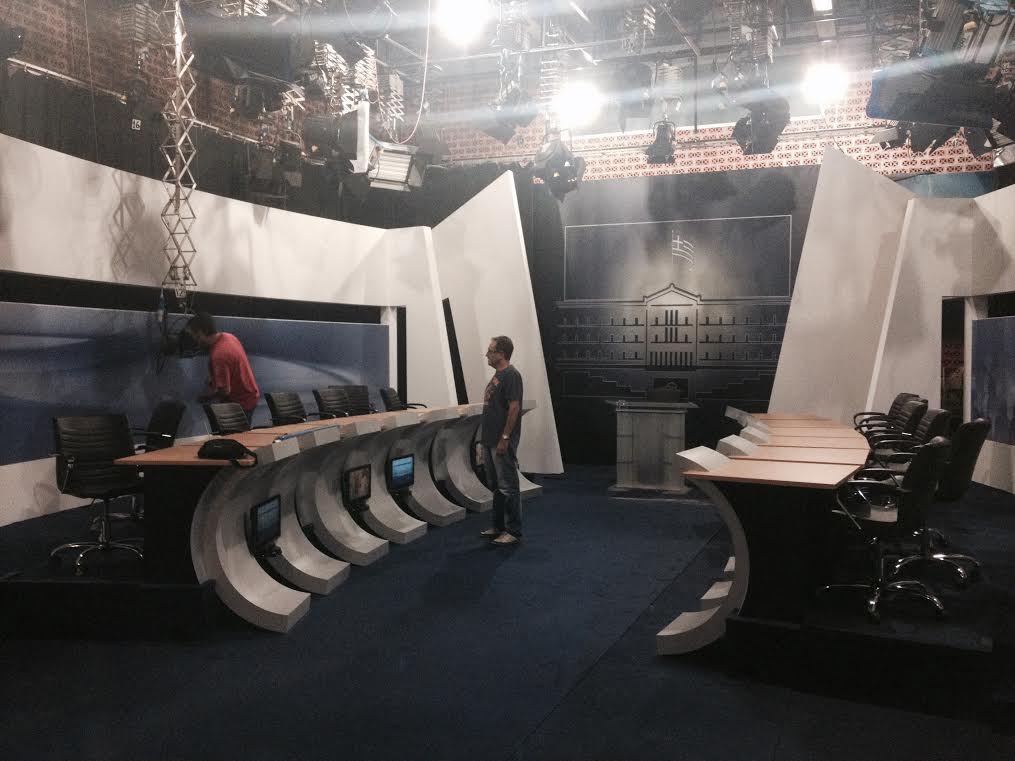 Το στούντιο 1 της ΕΡΤ είναι έτοιμο: Στο σκηνικό του debate -που ελάχιστες αλλαγές θα έχει από εκείνο της τηλεμαχίας που διεξήχθη έξι χρόνια πριν- πραγματοποιούνται οι τελευταίες εργασίες. Δοκιμαστικά στα φώτα, τις κάμερες, στη μείξη ήχου, στην καθαρότητα της εικόνας.