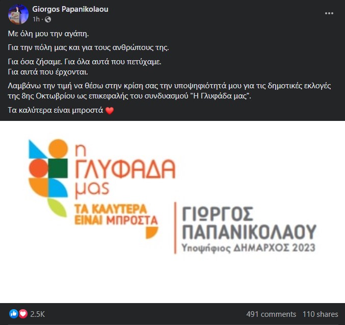 Λαμβάνω την τιμή να θέσω στην κρίση σας την υποψηφιότητά μου για τις δημοτικές εκλογές της 8ης Οκτωβρίου ως επικεφαλής του συνδυασμού “Η Γλυφάδα μας”.