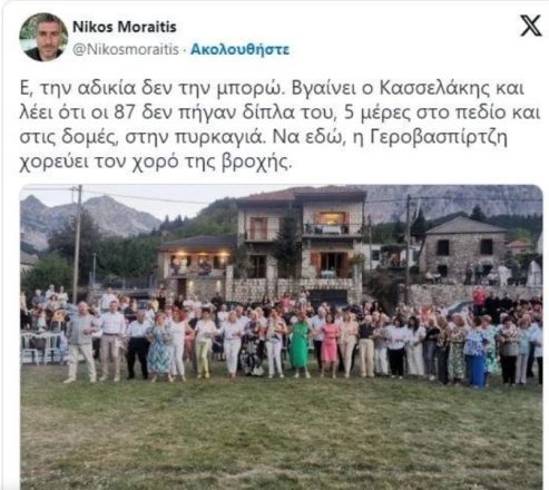 Σε ανάρτησή του ο συνεργάτης του Στέφανου Κασσελάκη, Νίκος Μωραΐτης αναφέρεται στην Όλγα Γεροβασίλη σημειώνοντας: «Ε, την αδικία δεν την μπορώ. Βγαίνει ο Κασσελάκης και λέει ότι οι 87 δεν πήγαν δίπλα του, 5 μέρες στο πεδίο και στις δομές, στην πυρκαγιά. Να εδώ, η Γεροβασπίρτζη χορεύει τον χορό της βροχής», τονίζει σκωπτικά.