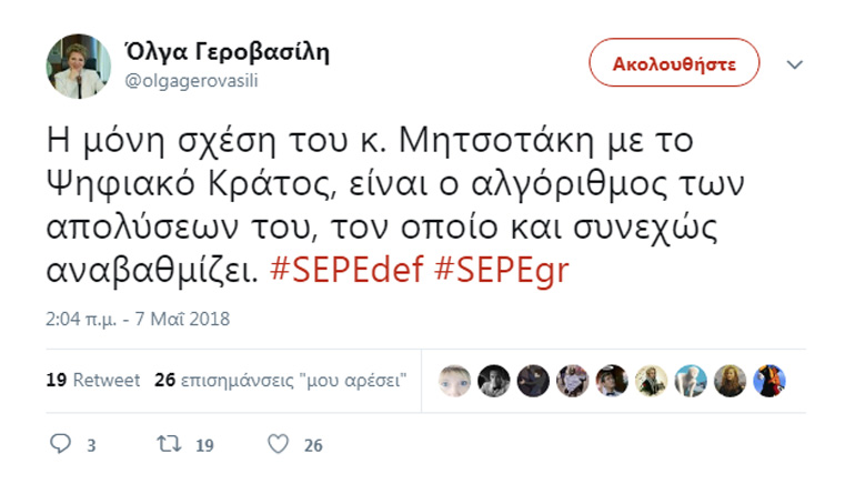 «Η μόνη σχέση του κ. Μητσοτάκη με το ψηφιακό κράτος είναι ο αλγόριθμος των απολύσεών του, τον οποίο και συνεχώς αναβαθμίζει» σχολίασε η υπουργός Διοικητικής Ανασυγκρότησης Όλγα Γεροβασίλη, με ανάρτησή της στο Twitter, την ομιλία του προέδρου της ΝΔ, το πρωί, στο digital economy forum, που διοργανώνει ο Σύνδεσμος Επιχειρήσεων Πληροφορικής και Επικοινωνιών Ελλάδας (ΣΕΠΕ).