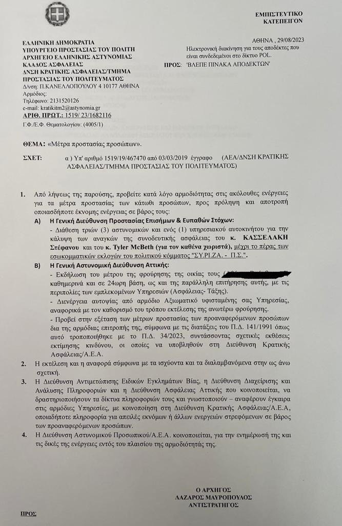 Το έγγραφο με το οποίο διατίθετο αστυνομική φρουρά στον κ. Κασσελάκη και τον σύντροφο του: