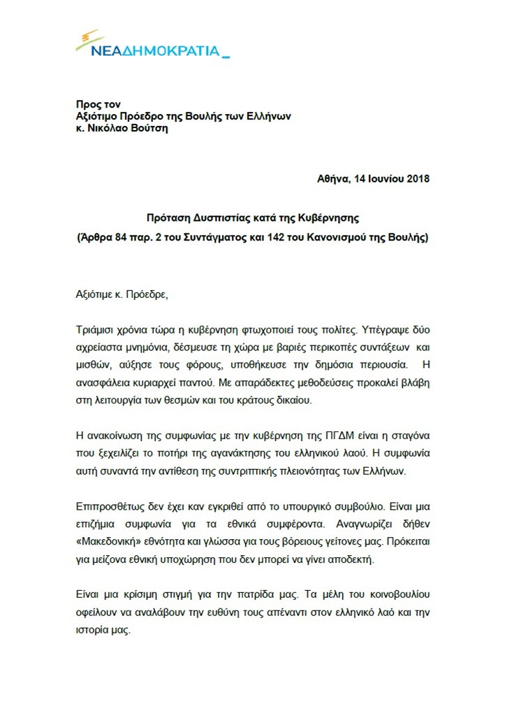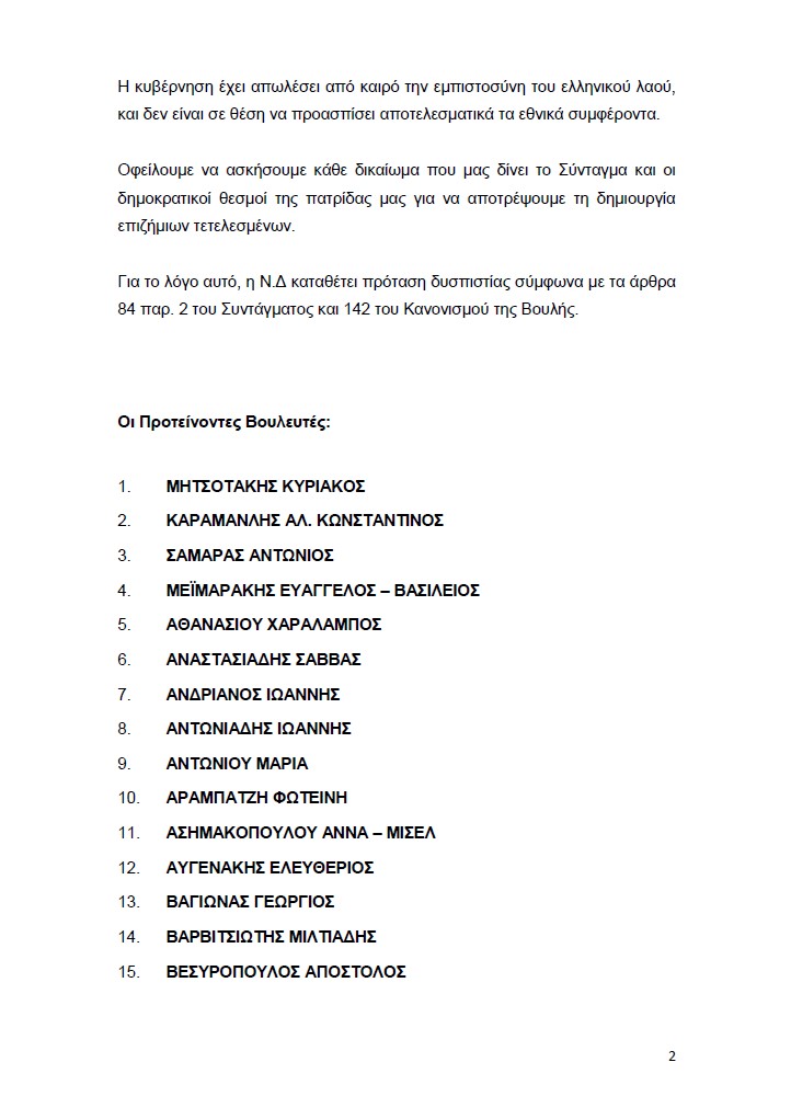 Διαβάστε εδώ ολόκληρο το κείμενο της πρότασης δυσπιστίας της Νέας Δημοκρατίας κατά της κυβέρνησης.
