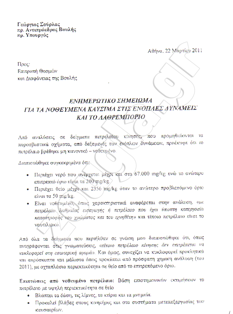 Ο κ. Σούρλας με επιστολή του στην Επιτροπή Θεσμών και Διαφάνειας της Βουλής φέρει προ των ευθυνών την κυβέρνηση, τα κόμματα, τις στρατιωτικές, δικαστικές αρχές, προκειμένου να ανοίξει ο «φάκελος» λαθρεμπορίου-νοθευμένων καυσίμων.