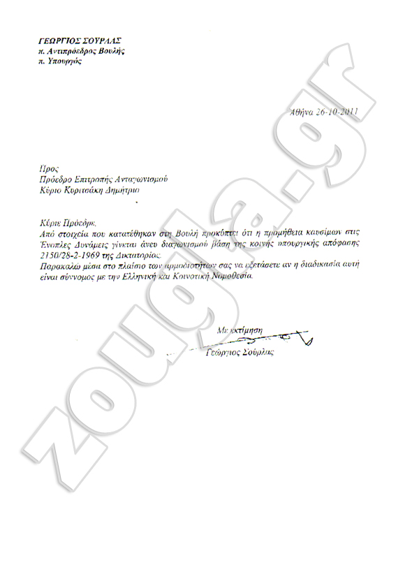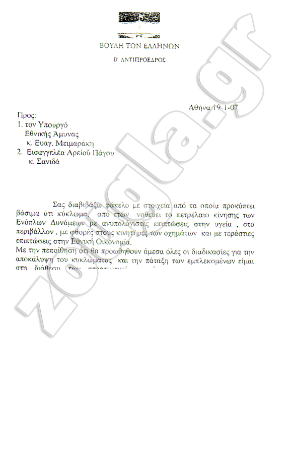 Από τις αρχές Ιανουαρίου η zougla.gr έφερε στη δημοσιότητα τέσσερεις επιστολές του πρώην Αντιπροέδρου της Βουλής, Γιώργου Σούρλα και ένα ενημερωτικό σημείωμα για την κορυφή του παγόβουνου αυτής της υπόθεσης που είναι το γιγαντιαίο δίκτυο νοθείας στα καύσιμα των Ενόπλων Δυνάμεων.