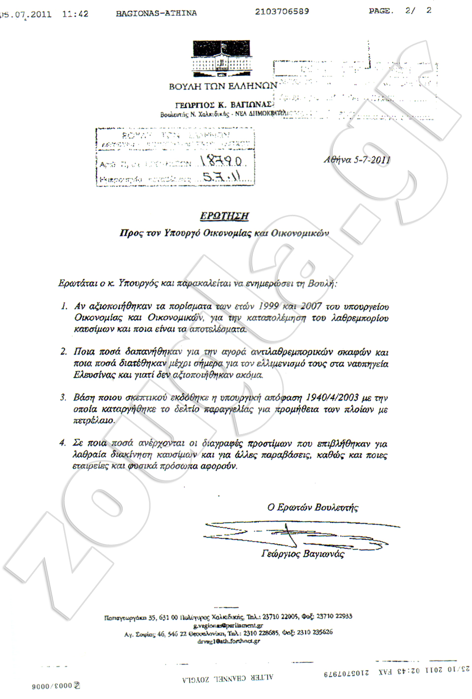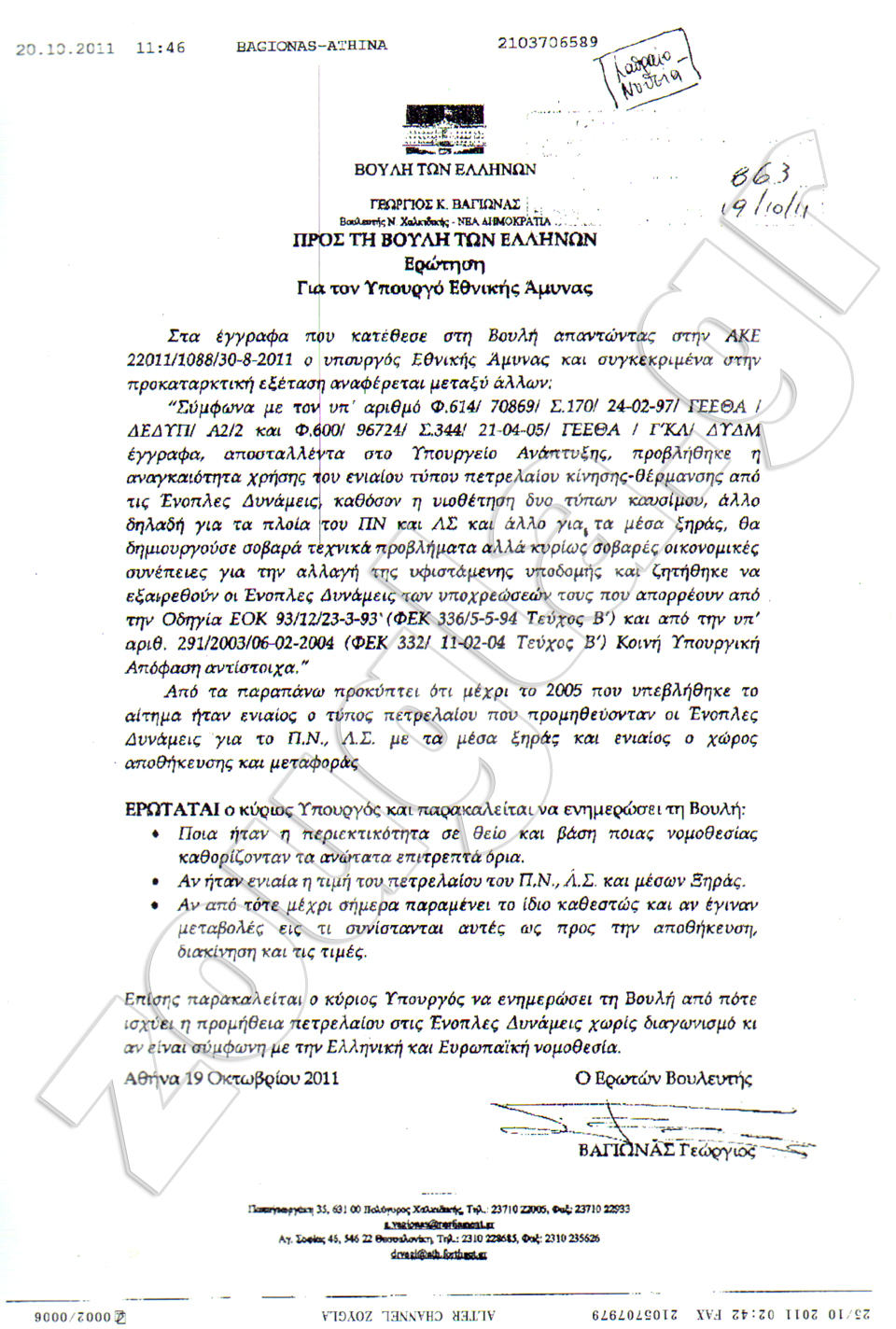 Δείτε τις ερωτήσεις του βουλευτή Χαλκιδικής, κ. Γ. Βαγιωνά και την απάντηση του πρώην υπουργού Άμυνας, Πάνου Μπεγλίτη για το θέμα.