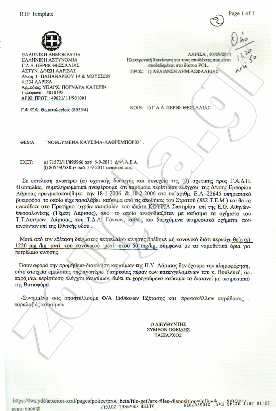 Ο φάκελος λαθρεμπόριο-νοθεία καυσίμων άνοιξε. Στρατιωτική μονάδα της Βόρειας Ελλάδας, νευραλγικής σημασίας, χρησιμοποιεί νοθευμένα καύσιμα, τα οποία επί της ουσίας καταστρέφουν τους κινητήρες των οχημάτων και των αρμάτων μάχης. Η zougla.gr απευθύνθηκε σε διαπιστευμένο χημικό εργαστήριο και βάσει της χημικής ανάλυσης το καύσιμο ήταν μη κανονικό.