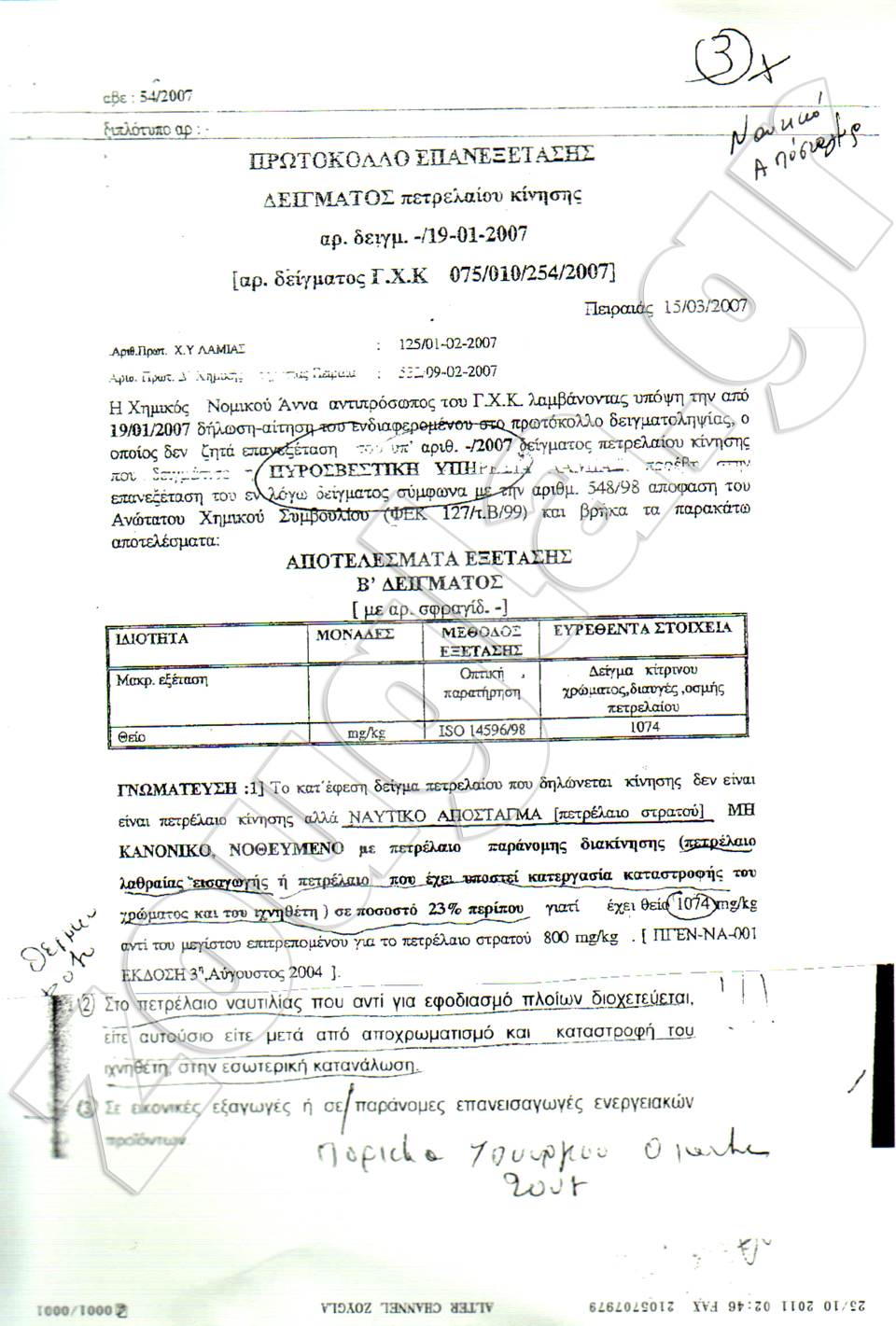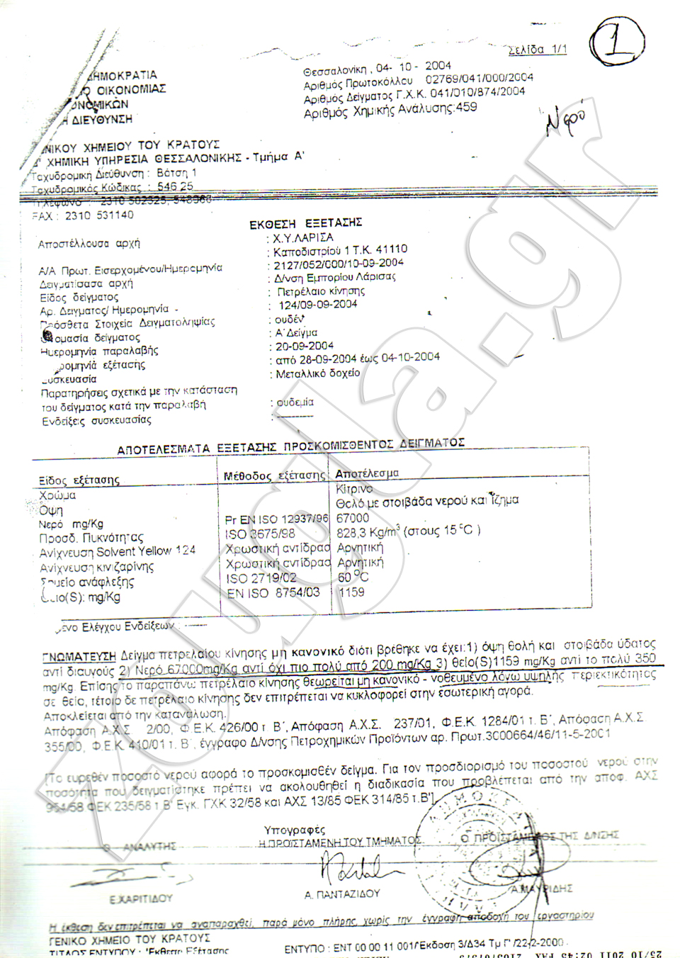 Από τις αναλύσεις προέκυψε ότι το πετρέλαιο βρέθηκε μη κανονικό – νοθευμένο καθώς περιείχε νερό που ανέρχεται μέχρι και στα 67.000 mg/kg ενώ το ανώτερο επιτρεπτό όριο είναι τα 200 mg/kg, θείο μέχρι και 2356 mg/kg όταν το ανώτερο προβλεπόμενο όριο είναι τα 50 mg/kg.