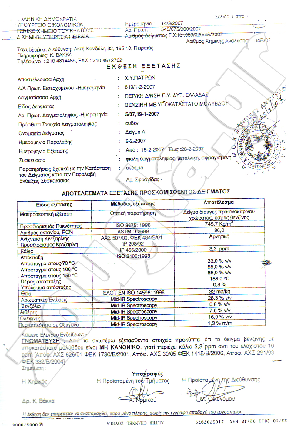 Από αμέτρητες αναλύσεις δειγμάτων του πετρελαίου κίνησης, που προμηθεύονται από τις Ε.Δ, προέκυψε ότι το πετρέλαιο βρέθηκε μη κανονικό – νοθευμένο σύμφωνα με την ανάλυση του Γενικoύ Χημείου του Κράτους.