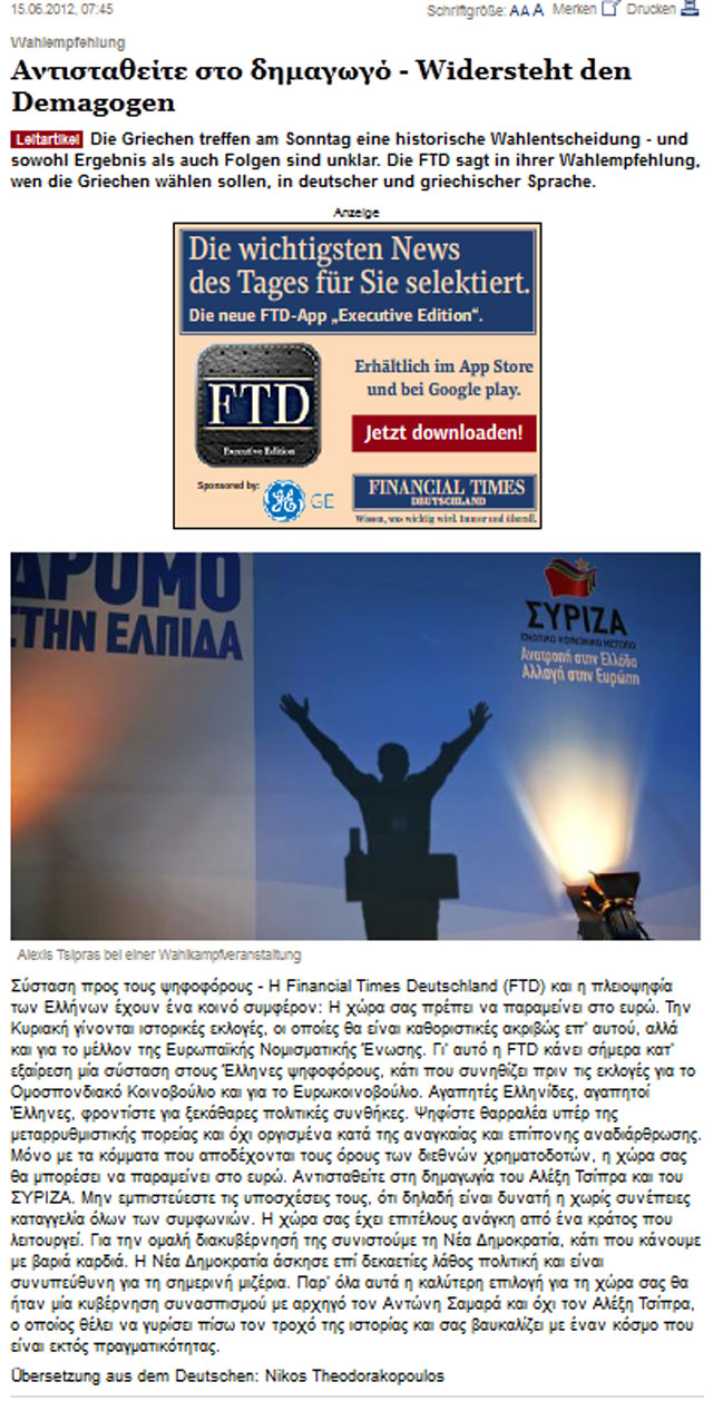 Οι «Financial Times Deutschland» φιλοξενούν πρωτοσέλιδο άρθρο με τίτλο «Αντισταθείτε στον δημαγωγό» και κεντρική φωτογραφία από προεκλογική συγκέντρωση του ΣΥΡΙΖΑ.