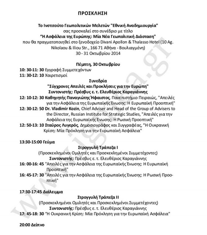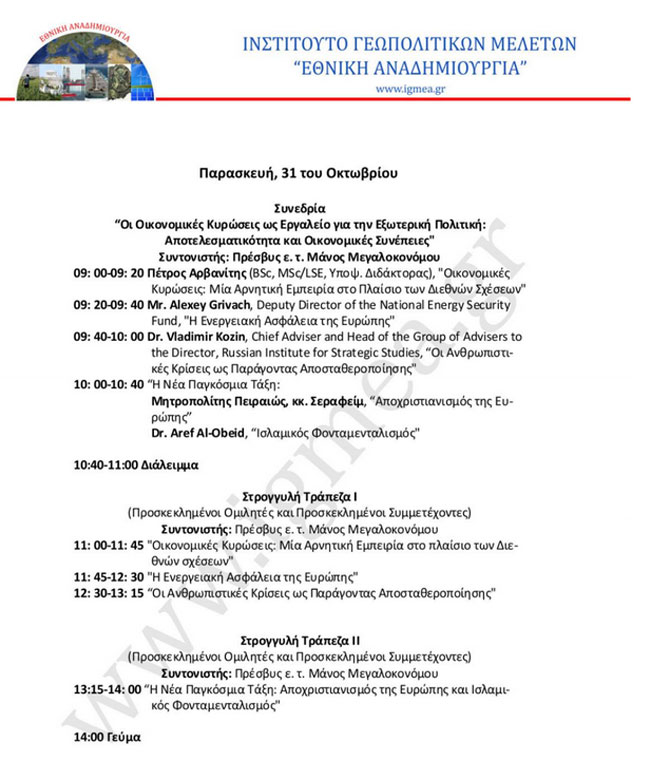 Το Ινστιτούτο Γεωπολιτικών Μελετών «Εθνική Αναδημιουργία» διοργάνωσε συνέδριο με θέμα: «Η Ασφάλεια της Ευρώπης: Μία Νέα Γεωπολιτική Διάσταση» (The Security of Europe: A New Geopolitical Dimension). Το συνέδριο πραγματοποιείται σε ξενοδοχείο της Αθήνας, στις 30-31 Οκτωβρίου.