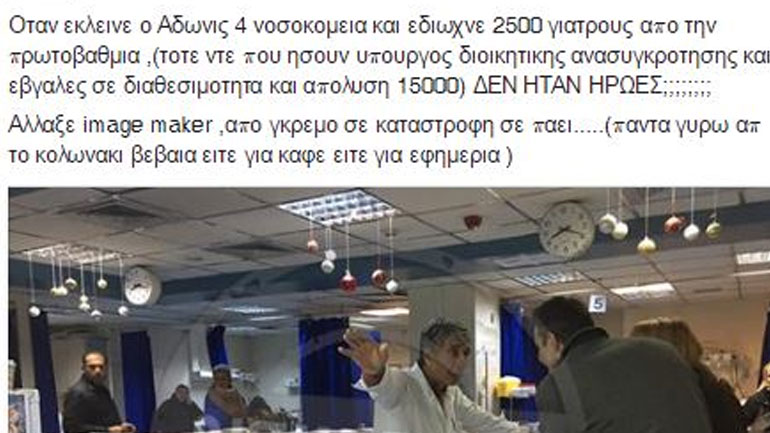 Μάλιστα, φαίνεται ότι ο κ. Πολάκης ενοχλήθηκε ιδιαίτερα από την αιφνιδιαστική επίσκεψη του κ. Μητσοτάκη στο νοσοκομείο και έκανε ανάρτηση στον λογαριασμό του στο Facebook στις 04.00 τα ξημερώματα.