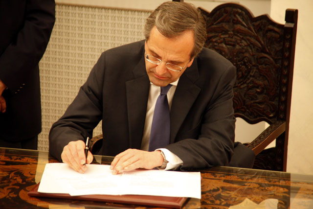 (Ο Αντώνης Σαμαράς υπογράφει βάσει του πρωτοκόλλου)