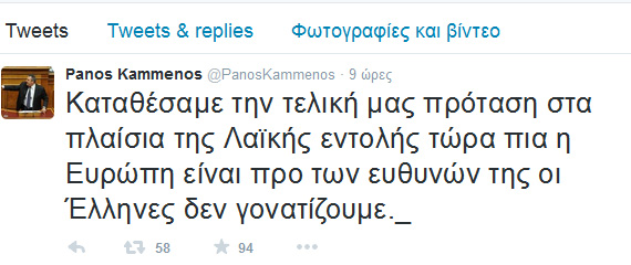 Παρέμβαση σε υψηλούς τόνους από τον πρόεδρο των ΑΝΕΛ μέσω Twitter. Ο κυβερνητικός εταίρος και υπουργός Άμυνας Πάνος Καμμένος αναφέρθηκε στην πορεία των διαπραγματεύσεων, ξεκαθαρίζοντας: