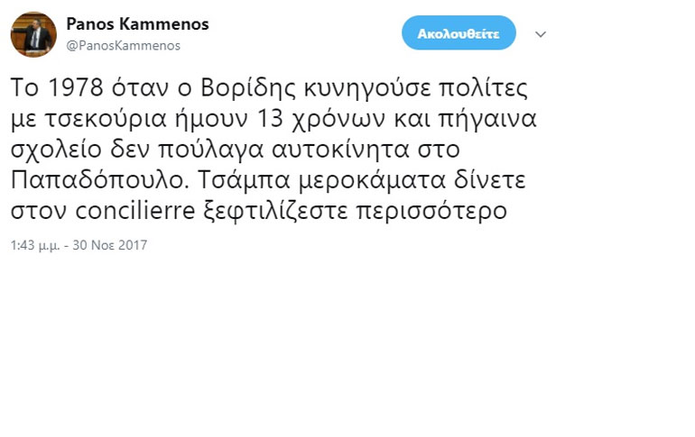 «Το 1978 όταν ο Βορίδης κυνηγούσε πολίτες με τσεκούρια ήμουν 13 χρόνων και πήγαινα σχολείο δεν πούλαγα αυτοκίνητα στον Παπαδόπουλο. Τσάμπα μεροκάματα δίνετε στον concilierre ξεφτιλίζεστε περισσότερο» αναφέρει ανάρτηση του υπουργού Άμυνας και προέδρου των Ανεξάρτητων Ελλήνων Πάνου Καμμένου στον προσωπικό του λογαριασμό στο Twitter.