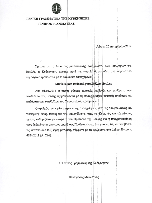 Σύμφωνα με ανακοίνωση του γραμματέα της κυβέρνησης Παναγιώτη Μπαλτάκου, η κυβέρνηση, αμέσως μετά τις γιορτές θα εντάξει τροπολογία στο φορολογικό νομοσχέδιο, σύμφωνα με την οποία «από 1.1.2013 οι πάσης φύσεως τακτικές αποδοχές και επιδόματα των υπαλλήλων της Βουλής εξομοιώνονται με τις πάσης φύσεως τακτικές αποδοχές και επιδόματα των υπαλλήλων του Υπουργείου Οικονομικών».