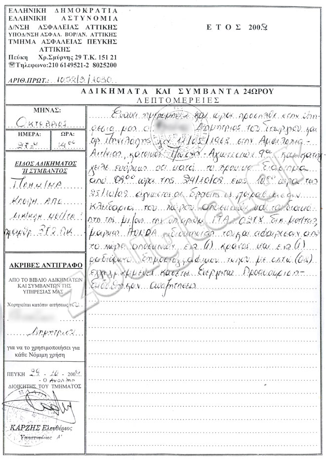 Προκειμένου να εκφοβίσουν τον αυτόπτη μάρτυρα αλλά και να ανακαλύψουν ενοχοποιητικά στοιχεία για τη δράση του κυκλώματος των κατασκευαστών και του ίδιου του προέδρου της κατασκευαστικής εταιρείας, δύο μπράβοι διέρρηξαν τρεις φορές το αυτοκίνητό του. Ακολουθεί το αποδεικτικό της κατάθεσής του για την εν λόγω διάρρηξη στο αστυνομικό τμήμα της περιοχής του.