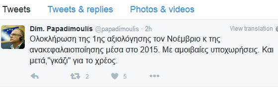 «Ολοκλήρωση της 1ης αξιολόγησης τον Νοέμβριο κ της ανακεφαλαιοποίησης μέσα στο 2015. Με αμοιβαίες υποχωρήσεις. Και μετά “γκάζι” για το χρέος» έγραψε ο κ. Παπαδημούλης στον λογαριασμό του στο Τwitter.
