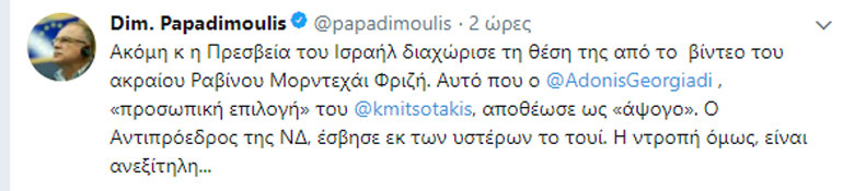 «Ακόμη κ η Πρεσβεία του Ισραήλ διαχώρισε τη θέση της από το βίντεο του ακραίου Ραβίνου Μορντεχάι Φριζή. Αυτό που ο @AdonisGeorgiadi, “προσωπική επιλογή” του @kmitsotakis, αποθέωσε ως “άψογο”. Ο Αντιπρόεδρος της ΝΔ, έσβησε εκ των υστέρων το τουί. Η ντροπή όμως, είναι ανεξίτηλη…».