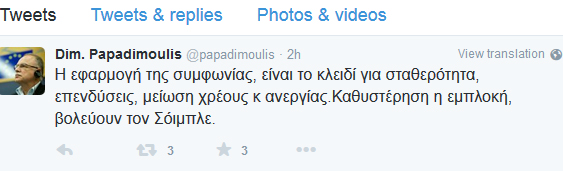 «Η εφαρμογή της συμφωνίας είναι το κλειδί για σταθερότητα, επενδύσεις, μείωση χρέους και ανεργίας. Καθυστέρηση ή εμπλοκή βολεύουν τον Σόιμπλε» έγραψε ο κ. Παπαδημούλης στον προσωπικό του λογαριασμό στο Twitter.