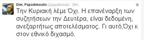 Με σημερινό του tweet στον προσωπικό του λογαριασμό, ο ευρωβουλευτής του ΣΥΡΙΖΑ Δημήτρης Παπαδημούλης τάσσεται υπέρ του «Όχι», ενώ ξεκαθαρίζει πως η επανέναρξη συζητήσεων τη Δευτέρα, είναι δεδομένη.