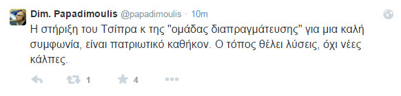 «Η στήριξη του Τσίπρα και της “ομάδας διαπραγμάτευσης” για μια καλή συμφωνία είναι πατριωτικό καθήκον. Ο τόπος θέλει λύσεις, όχι νέες κάλπες» έγραψε χαρακτηριστικά στον προσωπικό του λογαριασμό στο Twitter ο κ. Παπαδημούλης.