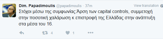 «Στόχοι μέσω της συμφωνίας: Άρση των capital controls, συμμετοχή στην ποσοτική χαλάρωση και επιστροφή της Ελλάδας στην ανάπτυξη στα μέσα του ‘16» έγραψε ο κ. Παπαδημούλης στην προσωπική του σελίδα στο Twitter.