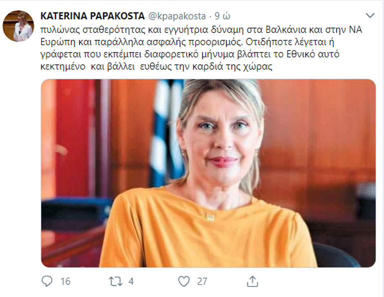 Η Ελλάδα είναι πυλώνας σταθερότητας και εγγυήτρια δύναμη στα Βαλκάνια και στην ΝΑ Ευρώπη και παράλληλα ασφαλής προορισμός αναφέρει η υφυπουργός Προστασίας του Πολίτη, Κατερίνα Παπακώστα με ανάρτησή της στο twitter και υπογραμμίζει πως οτιδήποτε λέγεται ή γράφεται που εκπέμπει διαφορετικό μήνυμα βλάπτει το Εθνικό αυτό κεκτημένο.